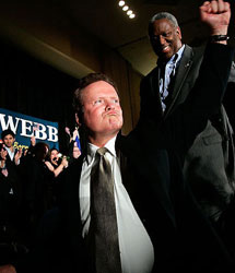 | | Jim Webb claims victory over Senator George Allen, the Republican incumbent, giving Democrats control of Capitol Hill for the first time since 1994. (Alex Wong/Getty Images) | Democrats, as widely expected, wrested control of the House of Representatives from the Republicans, after 12 years of Republican rule, in elections across the country Tuesday, setting the stage for a series of intensive investigations of the Bush administration by several different House committees.