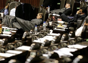 | | Mexican legislators sleep at the Congress hall, in Mexico City, Mexico, Wednesday, Nov. 29, 2006, just days before President-elect Felipe Calderon is to be named president. Leftist lawmakers supporting his chief rival,Andres Manuel Lopez Obrador, took over the podium to protest Friday's inauguration of the business-friendly president-elect. (AP/Eduardo Verdugo) | Opposition legislators sprawled across the congressional speaker's platform in their standoff with ruling conservatives Wednesday, vowing not to budge in hopes of blocking Friday's inauguration of President-elect Felipe Calderon.