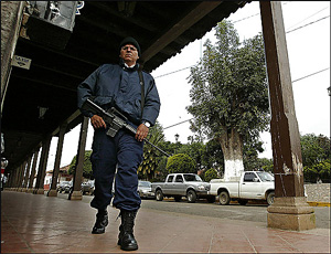 | | A policeman patrols the town of Villa Madero in Michoacan state, where six policemen were gunned down this month. (Guillermo Arias/AP) | Zihuatanejo, Mexico - Andres Sauzo collects newspapers, astoundingly grisly newspapers.