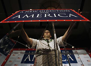 | | Worker David Plevan sets the stage for U.S. House of Representatives Democratic party Minority leader Nancy Pelosi's election night party at a Washington hotel, November 7, 2006. (Reuters/Jason Reed) | Democrats scored key early victories on Tuesday in a bruising election fight that could sweep President George W. Bush's Republicans out of power in Congress and increase pressure for a new policy in Iraq.
