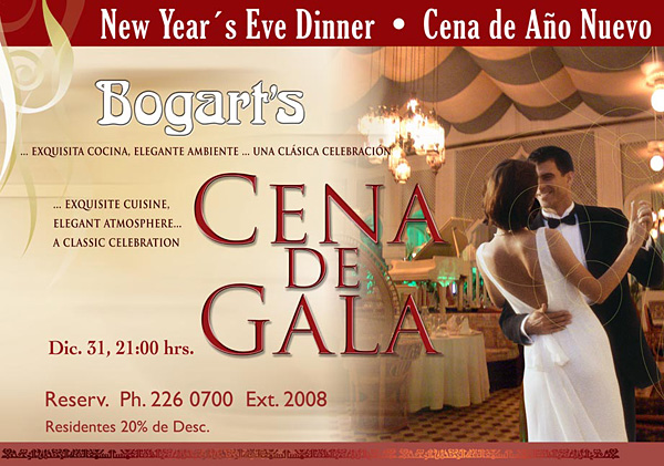 Bogart's Traditional New Years Eve Gala Dinner includes everything necessary for a New Year's Eve to remember - an elegant five course meal accompanied by imported white and red wine, live music for dancing, party favors, and a glass of sparkling wine and the traditional Mexican '12 wishing grapes' for the midnight toast.