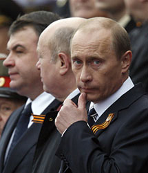 | | Russian President Vladimir Putin obliquely compared the foreign policy of the United States to the Third Reich in a speech on Wednesday commemorating the 62nd anniversary of the defeat of Nazi Germany. (Misha Japaridze/AP) | Editor's comment: This story appeared as the top story on The New York Times's web site home page at approximately 8:00 PM EDT on Wednesday. In less than an hour, the story was taken off the NYT home page completely and instead buried halfway down on the World page. No reason for the unusually rapid removal was offered by the Times. -ma/TO