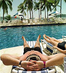 | Tourists relax by the pool at a seaside resort in Acapulco, Mexico.