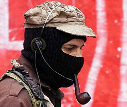 | | Subcomandante Marcos of the EZLN (Ejército Zapatista de Liberación Nacional, Zapatist Army of National Liberation), icon and poet warrior of the indigieous insurrgency and autonomous zone in Chiapas (Southeastern Mexico). | The Chiapas Red Alert called by the Zapatista National Liberation Army (EZLN) in mid-June set alarm bells ringing among the left and social movements in Latin America and beyond. In the event the Red Alert turned out to be a precautionary security measure, as the clandestine committee which leads the movement called the army, its political cadres and the leaders of the Chiapas autonomous municipalities to a ‘consulta’ – in effect a full-scale congress of the movement, to discuss a major political turn.