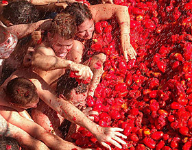 | | Crowds of people throw tomatoes at each other during the annual "tomatina" tomato fight fiesta in the village of Bunol, 50 kilometers outside Valencia, Spain, Wednesday Aug. 31, 2005. Some 36,000 people took part in this year's tomato fight using up to 100 tons of ripe tomatoes. The tomato fiesta was started in Bunol in 1944 and is held annually. | It is said to be the world's largest tomato battle. Tens of thousands of people hurled truckloads of tomatoes at each other Wednesday, sending knee-deep rivers of tomato sauce down the streets of the small Spanish town of Bunol during its annual food fight The Tomatina.
