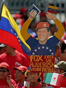 | | A supporter carries a sign with an image of Venezuelan President Hugo Chavez during a march in Caracas last week. (Daniel LeClair/Reuters) | On Tuesday November 22, the New York Times published an article titled: "Q and A: U.S.-Venezuelan Relations." The following piece asks the same questions but the answers are different.