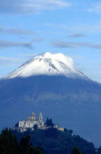 The ancient town has lots to offer visitors. Just a dozen miles from Puebla, Mexico's fourth-largest city, Cholula has several dozen elaborately decorated churches; a huge pyramid with a church on top and tunnels throughout; a yearly symphony of church bells; a religious fair that brings in an enormous market of arts and crafts; and, on a clear day, the sight of three volcanoes, one of which regularly belches smoke.