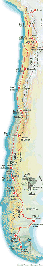 | | One car, 16 days and 4,500 miles of Chilean roads.... You call this a dream drive? | My driving partner, Charles LeGrand, and I fly into La Paz, Bolivia, on Oct. 27 to meet representatives from Land Rover, who hand over the LR3 HSE. This particular vehicle was already in Bolivia as part of Land Rover's G4 Challenge program — an extreme-sports competition held in some of the wildest parts of the globe. So the square, pumpkin-colored truck is expedition-ready, with roof racks, jerrycans for gasoline, winch and dazzling auxiliary lights. In the abysmal black of the high desert, Charles will observe, the lights make the LR3 look like a terrestrial mini-sub.