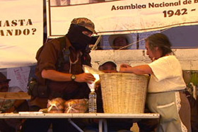 After forming the human fences that would allow Sup Marcos to pass through, those present began to chant warnings: “Somos braceros. No somos limosneros.” (“We are Braceros, not beggers.”) “Gobierno, ratero, regresa el dinero.” (“Theiving government, return our money!”) |