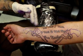 | | A tattoo artist works to apply a tattoo to the forearm of a National Guardsman at the Crescent City Tattoo Parlor in New Orleans, Louisiana October 18, 2005. The U.S. Army, which missed its recruiting goal last year, has relaxed its policy banning certain types of tattoos in a bid to attract new soldiers who otherwise would have been barred from serving. (Lucas Jackson/Reuters) | The U.S. Army, which missed its recruiting goal last year, has relaxed its policy banning certain types of tattoos in a bid to attract new soldiers who otherwise would have been barred from serving.