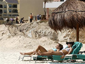 | | Caroline Keener, of Dallas, Texas, right, and Ally Wade, of San Antonio, Texas, take in the sun as construction workers continue renovations on a hotel in Cancun, Mexico. As Cancun looks to renew itself from its spring break roots and from the destruction left from last year's hurricane season, hotels like Le Blanc have moved in to provide more upscale, serene accomodations. (AP/Gregory Bull) | Cancun, Mexico - Classical music wafts through the Zen-like lobby of Le Blanc Spa Resort, a luxurious hotel where guests are greeted with fresh fruit drinks and a scented, moist towel. It's a far cry from what some may consider to be a typical Cancun hotel - teeming with the hollering, drunken U.S. college students who helped turn this Caribbean resort into Mexico's No. 1 foreign-tourist destination.