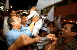 | | National Action Party (PAN) candidate Felipe Calderon hoists a baby during a campaign stop in Tehuacan, Mexico, last month. (Joel Merino/AP) | Conservative Felipe Calderón opened his campaign for president with slogans focusing on honesty ("Clean Hands") and patriotism ("Passion for Mexico"), but the nice-guy image wasn't working.