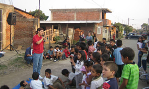 When we got there, the students did a couple of presentations to get people's attention. Once we had a crowd gathered, we informed everyone about the ubicación (location) of the clinic and other details. Many people seemed very responsive.