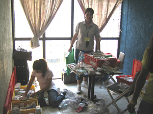 | | Preparing medical supplies to distribute. | Not very surprisingly, we got off to a late start. We had too many people to fit into the charter bus, so I ended up riding in a car with some other teachers. It was a little cramped with all of us stuffed in and our equipaje (luggage) in the back, but I preferred it over a bus loaded with hyper-energized adolescents.