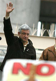 | | Andres Manuel Lopez Obrador, presidential candidate for the Party of the Democratic Revolution (PRD), waves to supporters during a rally outside Mexico's Federal Electoral Tribunal building in Mexico City. (Reuters/Daniel Aguilar) | Cold and wet from marathon street protests over election cheating claims, many supporters of Mexico's leftist opposition leader are losing hope that he can stop his conservative rival taking power.