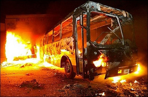 | | A bus burns as consequence of a riot between teachers on strike and some unknown agressors in Oaxaca, Mexico, 21 August 2006. The US State Department issued a statement alerting US citizens to violent demonstrations in the southern Mexican state of Oaxaca. (AFP/Dario Nolasco) | Oaxaca, Mexico – Gone are Oaxaca's familiar nighttime sounds of tinkling marimba music and vendors hawking chocolate or traditional fried grasshoppers, replaced by gunfire, the roar of burning tires and shouts from bands of men armed with clubs.