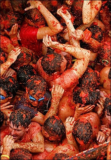 | | Revellers at the 2005 "Tomatina" in Bunol. Some 40,000 Spaniards were gathering in the eastern Spanish town to hurl some 100,000 kilograms (220,000 pounds) of tomatoes at one another to mark the 2006 version of one of the world's messiest festivals. (AFP/Jose Jordan) | Some 40,000 Spaniards were gathering in the eastern town of Bunol ready to create a 'human gazpacho,' hurling some 100,000 kilograms (220,000 pounds) of tomatoes at one another to mark La Tomatina, surely one of the world's messiest festivals.
