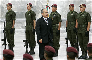 | | The Mexican president-elect, Felipe Calderón, passed by an honor guard yesterday in Mexico City. Calderón says he wants to stitch together left and right after a divisive election. (Eduardo Verdugo/ Associated Press) | Since being declared president-elect a week ago, Felipe Calderón, the conservative leader of the governing National Action Party, is spreading a message of conciliation and tolerance as he confronts a charismatic leftist opponent who insists that the election was rigged and who refuses to concede defeat.