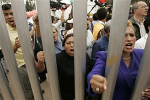 | | Supporters of Mexican presidential candidate Andres Manuel Lopez Obrador scream at the gates of the Federal Electoral Tribunal, TRFIFE, in Mexico City, Mexico on Tuesday Sept. 5, 2006. Felipe Calderon became president-elect of Mexico, two months after disputed elections, when the nation's top electoral court voted unanimously to reject allegations of fraud and certify his narrow victory. (AP/Dario Lopez-Mills) | Protesters still occupy Mexico City streets. The country is still divided along class lines. Two candidates each still claim to be the next president.