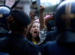 | | A woman yells in support of former presidential candidate Andres Manuel Lopez Obrador as a group of protesters await the arrival of President-elect Felipe Calderon at a dinner with the Inter American Press Association in Mexico City, Mexico, Sunday, Oct. 1, 2006. (AP/Gregory Bull) | Esperanza Luna, 60, spent 48 days this summer sleeping on a mattress under a tent in Mexico’s colonial plaza, the Zocalo.