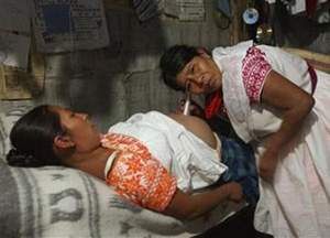 | | Nahua Indian midwife Josefina Amable monitors the heartbeat of mother-to-be Michaela Ramirez's baby during a routine home visit outside Cuetzalan, some 185 miles from Mexico City October 24, 2006. Now, under a government pilot program mixing high-tech with sacred tradition, these midwives - often the only people many women trust in one of Mexico's poorest regions - are helping doctors keep mothers and babies alive, while picking up new tips from modern medicine. (Jennifer Szymaszek/Reuters) | From cutting the umbilical chord to post-natal surgery, giving birth in the remote Sierra Norte mountains of central Mexico used to be a dirty and dangerous experience.