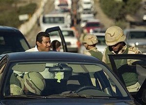 | | Mexican soldiers check a vehicle in a checkpoint on the outskirts of Tijuana, Mexico, Friday, Jan. 5, 2007. Soldiers and federal police poured into the violent border city of Tijuana, manning checkpoints and inspecting local police stations as part of President Felipe Calderon's latest offensive against powerful drug gangs. (AP/Guillermo Arias) | U.S. sailors and high school students cruised bars and nightclubs in Mexico's racy Tijuana border city at the weekend, undaunted by a crackdown on violent drug gangs by thousands of Mexican security forces.