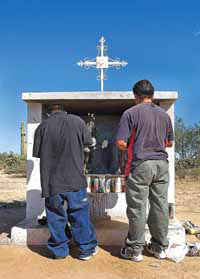 | | A desert altar along the toll road from Altar to Sasabe, Mexico, is one of the last places migrants can stop and worship before traveling the dirt road used mainly for shuttling migrants to various spots where they will attempt to enter the United States. (AP/Matt York) | Sasabe, Mexico - The dusty Grand Central Station of illegal journeys into the United States lies on the fringes of this village near the Arizona border, in a junkyard littered with demolished cars.