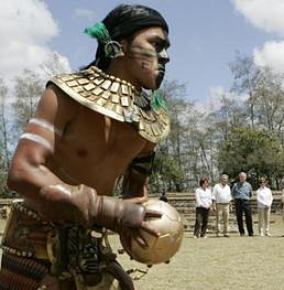 | | George W. Bush, first lady Laura Bush and the wife of Guatemala President Oscar Berger watch a reenactment of a Mayan game. | Mérida, Mexico - Your place or Mayan?
