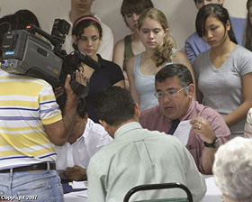 | | Francisco López of Salem (right) discusses migration issues with members of the board of directors of the Association of Rural Communities for the Development of El Salvador during a fact-finding trip to the Central American nation last month. Student delegates from Seattle, Wash., look on. This news conference took place in the capital city of San Salvador. (Statesman Journal) | Free-trade agreements, poverty, environmental degradation and lack of jobs are among the reasons people from El Salvador migrate to the United States, said members of a delegation of religious leaders and people of faith from Salem who traveled to the region.