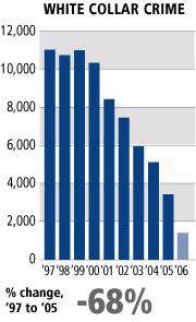 If the FBI had continued investigating financial crimes at the same rate as it had before the World Trade Center came down, about 2,000 more white-collar criminals would be behind bars, according to the P-I analysis, which was based on Justice Department data from 1996 through June 2006. Since 9/11, the number of white-collar convictions in federal courts has dropped about 30 percent.