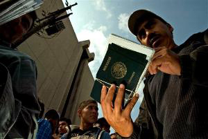 | | Mexicans line up outside the U.S. Consulate in Monterrey, Mexico, as they wait for a working visa interview. Supplying the U.S. guest worker program is a complicated and sometimes criminal network of foreign recruiters who extort money from poor migrants and then keep them on the job by forcing them into debt or threatening their families back home. (AP/Guillermo Arias) | Monterrey, Mexico - Standing in the baking sun outside the U.S. Consulate in Monterrey, hundreds of Mexicans wait anxiously for temporary work visas. But even before they were fingerprinted and interviewed for the permit, many had already paid recruiters thousands of dollars in hopes of easing the way.