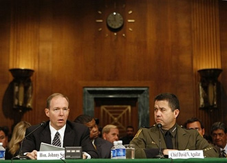 | | U.S. Attorney Johnny Sutton, left, and David V. Aguilar, Chief of Office of Border Patrol for U.S. Customs and Border Protection, testify on Capitol Hill in Washington, Tuesday, July 17, 2007, before the Senate Judiciary hearing on the prosecution of Jose Alonso Compean and Ignacio Ramos, two former Border Patrol agents imprisoned for shooting a drug smuggler in the backside as he sprinted toward Mexico. (AP/Gerald Herbert) | Washington - The House on Wednesday approved a move by conservative Republicans to try to set free two Border Patrol agents convicted of shooting a Mexican drug dealer.