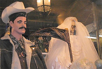 Worshipers gaze on the plastic portrayals of Malverde, a blue bandanna peeking out from beneath a cowboy hat jauntily perched on his head, and La Santísima Muerte, the skeletal patron saint of death. La Santísima Muerte, who carries a scythe a la the Grim Reaper, wears a frilly white wedding dress. They look like a couple about to say their vows.