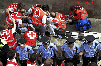 | | The sixth bull run of the San Fermin festival, an annual event in the Spanish city of Pamplona, ended with 13 injuries, including six people who were gored by bull horns. Three of these people were very seriously hurt. Medics had to put a collar on this man during the running on Tuesday. (Baltasar Garcํa) | Madrid - Charging bulls gored seven people and seriously injured several others yesterday as this year's San Fermin festival in Pamplona served up its longest and most dangerous run yet.