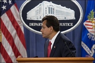 | | US Attorney General Alberto Gonzales leaves the podium following a press conference at the US Department of Justice in Washington, DC, 27 Aug. Robbed of one of their favorite targets by the sudden resignation of Gonzales, Democrats are trying to shape the next battle with a retooled White House. (AFP/Saul Loeb) | Questions linger about limits on civil liberties and influence of politics on justice.