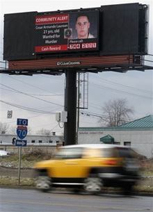 | | Motorists drive near an electronic billboard with the picture of Cesar Laurean, a Marine wanted in the slaying of a pregnant colleague, Monday, Jan. 14, 2008, in Columbus, Ohio. The sheriff announced a $25,000 reward for information leading to the arrest of Marine Cpl. Cesar Armando Laurean. (AP/Jay LaPrete) | | | San Antonio, TX - A methamphetamine dealer who gunned down a deputy during a traffic stop in Southern California. A man in Arizona who killed his ex-girlfriend's parents and brother and snatched his children. A man who suffocated his baby daughter and left her body in a toolbag on an expressway overpass near Chicago.