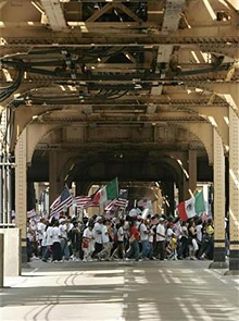 | | Supporters, demanding rights for illegal immigrants, pass under elevated train tracks during an immigration march through downtown Chicago May 1, 2007. Illegal immigrants from Latin America are heading deeper into the United States to find work and avoid deportation as crackdowns in border states like Texas and Arizona make life more difficult for them. (Reuters/Frank Polich) | | | Nuevo Laredo, Mexico - Illegal immigrants from Latin America are heading deeper into the United States to find work and avoid deportation as crackdowns in border states like Texas and Arizona make life more difficult for them.