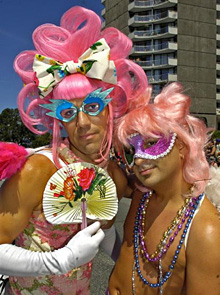 | | The Vancouver Gay Pride Parade along Beach Avenue Sunday drew over 300,000 spectators to see the colourful floats and costumes. Two bronzed goddesses stop to pose. (Peter Battistoni/Vancouver Sun) | | | Vancouver has been recognized as the number one gay leisure travel destination in Canada for the second consecutive year, according to a survey of U.S. gay and lesbian travelers.
