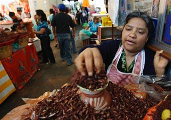 | | Peta Ruiz sells a local delicacy of grasshoppers bathed in chile powder and salt in the city market in Oaxaca, Mexico, Tuesday, Jan. 8, 2008. More than a year after police evicted protesters who held the city for months, visitors to Oaxaca will find a less crowded city with more local flavor than it had before the 2006 political uprising. (AP/Gregory Bull) |