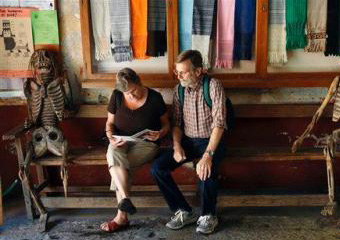 | | Ellie and Fred Schowalter, of Los Osos, Calif., look at a guidebook flanked by two skeletons in Oaxaca, Mexico, Tuesday, Jan. 8, 2008. More than a year after police evicted protesters who held the city for months, visitors to Oaxaca will find a less crowded city with more local flavor than it had before the 2006 political uprising. (AP/Gregory Bull) |