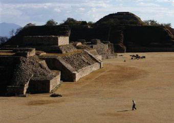 | | A lone vendor walks among the ruins of Monte Alban in Oaxaca, Mexico, Monday, Jan. 7, 2008. More than a year after police evicted protesters who held the city for months, visitors to Oaxaca will find a less crowded city with more local flavor than it had before the 2006 political uprising. (AP/Gregory Bull) |