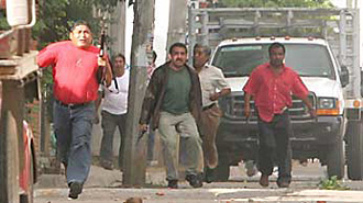 | | The accused murderers of William Bradley Roland, caught on videotape as they press their assualt. Juan Carlos Soriano Velasco "El Chapulín" (at left in red t-shirt), Oaxacan police; Manuel Aguilar (middle, dark jacket), chief of staff of Santa Lucia, and Santiago Zárate (on the right in the red shirt), Director of Public Safety. |