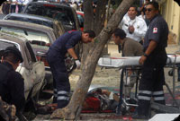 | | They prepare to take the body of the victim off the scene. | | | Mexican police say the reason behind Friday explosion carried out by an unidentified man near the police headquarters is still unknown.