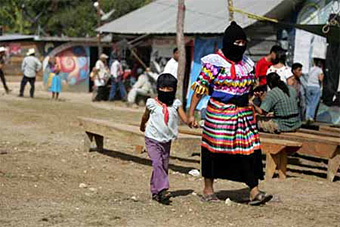 | | A Zapatista woman and child walk through the Caracol of La Garrucha during the gathering between Zapatista women and women of the world. (Tim Russo) |