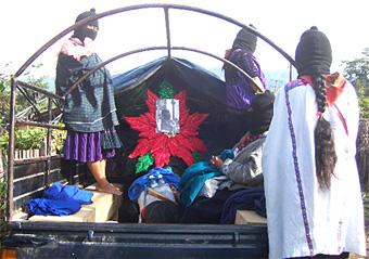 | | Zapatista women at the end of the encuentro in the back of a truck with a shrine to Comandante Ramona. (Marina Sitrin) | | | December 29 - 31 women from all five Zapatista Caracoles (centers of resistance) gathered in the community of La Garrucha, Chiapas to meet with women who had come from all around the world to hear their stories of struggling, organizing, and participating in the Zapatista movement, and to share their own experiences. It was the Tercer Encuentro de los Pueblos Zapatistas con los Pueblos del Mundo - the Third Encounter/Gathering between Zapatista Peoples and Peoples of the World.