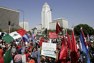 | | Marchers congregate at the intersection of 1st street and Broadway as Los Angeles City Hall is seen behind them during a May Day immigration and labor march and rally in downtown Los Angeles, May 1, 2008. (Reuters/Danny Moloshok) | | | Immigration reform activist William Gheen believes the recent May Day rallies by illegal immigrants across the country demonstrate once again that many of them are more loyal to their country of origin than to the United States.