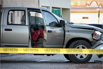 | | In Villa Ahumada, Mexico, on May 18. The night before, dozens of gunmen killed six people in the town, including two civilians who were together in a pickup truck, and abducted others. (El Heraldo de Chihuahua) | | | The recent slayings of several officers and civilians are emblematic of the nation's raging drug violence.