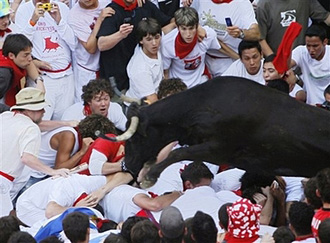 | | A calf jumps over a crowd of revelers at the bullring on during the San Fermin festival in Pamplona, northern Spain, Thursday, July 10, 2008. The fiestas 'Los San Fermines' held since 1591, attracts tens of thousands of foreign visitors each year for nine days of revelry, morning bull-runs and afternoon bullfights. (AP/Daniel Ochoa de Olza) | | | Pamplona, Spain - A pack of fighting bulls gored a Spaniard, knocked an American unconscious and injured five other people Thursday in a dash through the streets of Pamplona to the city bullring, officials said.