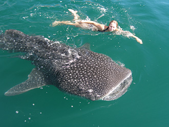 | | For details on the whale shark program, click HERE, as well as any of the other vacation packages offered year-round by Baja AirVentures please see BajaAirVentures.com. | | | While not necessarily soft and cuddly, the up to 60-feet whale sharks, the world's largest fish, eat plankton - not people. This makes observing and, yes, swimming with them a people treat in September and October when the whale sharks make their annual fall return to the nutrient-rich waters of Mexico's Sea of Cortez.