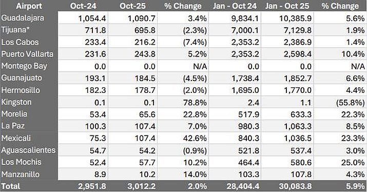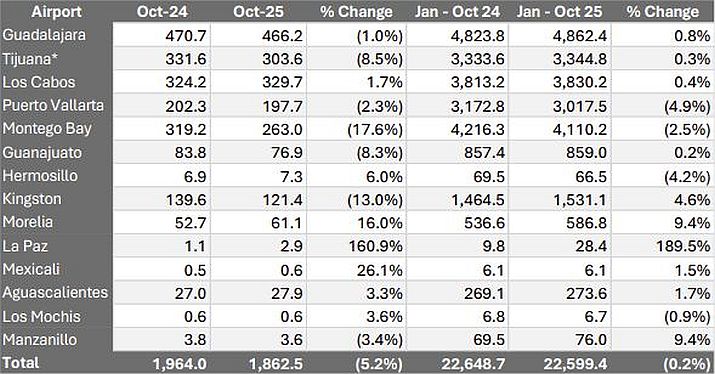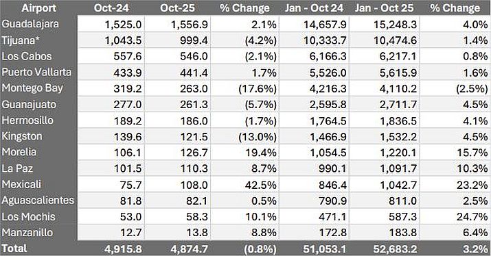 During this period, the total number of terminal passengers at GAP’s 12 Mexican airports increased by 0.7%, compared to October 2024. Guadalajara and Puerto Vallarta airports presented an increase in passenger traffic of 2.1% and 1.7%, respectively, while Tijuana, and Los Cabos airports decreased 4.2%, and 2.1%, respectively.